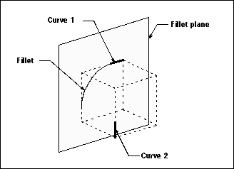 If neither curve is a point, the fillet plane is the plane that contains the tangent of the first curve. The plane is normal to the vector that is normal to both tangents. The two curves do not need to lie in the same plane and the fillet is completely independent of the WCS.