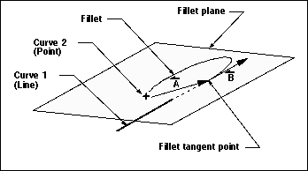 If only one curve is a point, the fillet plane is defined as the plane which contains the vector between the point and the fillet tangency point (A), and the tangent of the filleted object (B) (see the figure below). The fillet plane is totally independent of the WCS.