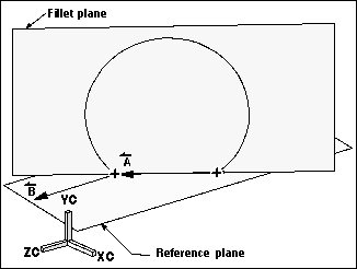 If a fillet is created between two points, it is created in a plane based on the location of the points. In the figure below, the reference plane is defined by a vector between each point (A) and the vector parallel with the ZC axis (B). The fillet is created in the plane containing each point and normal to the reference plane.