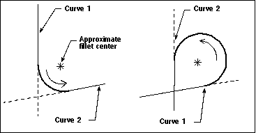 Constructs a fillet between two curves, including points, lines, circles, conics or splines. A two curve fillet is an arc generated in the counterclockwise direction from the first curve to the second. The fillet created by this method is tangent to both curves. |